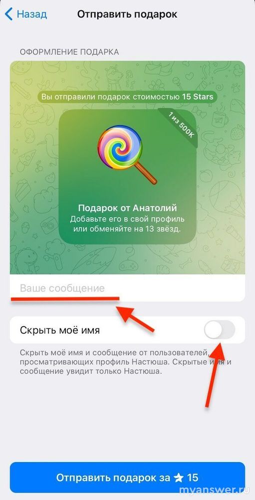 И уже здесь вы можете не только написать какой-то текст к подарку, но и скрыть свое имя (перетащив ползунок вправо), и контакт получит анонимный подарок. Осталось нажать на кнопку «Отправить подарок за…».
