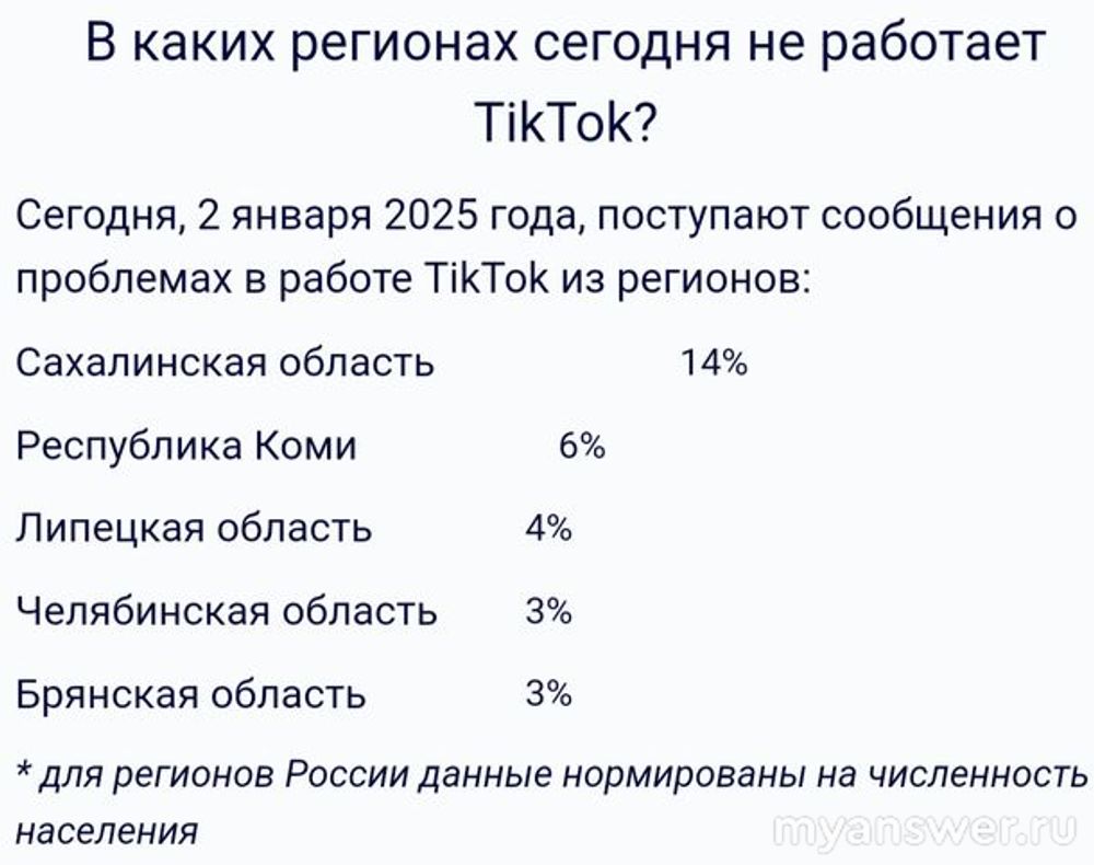 В основном отзывы о плохой работе ТикТок были получены из Сахалинской области, республики Коми, Липецкой области.