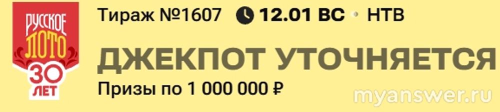 Тираж известной и популярной лотереи "Русское лото" за номером 1607 будет разыгран во второе воскресенье января 2025 года, а именно 12 января 2025.Розыгрыш традиционно пройдет на телеканале НТВ в 8 часов 20 минут. Телепрограмма, в которой проводятся розыгрыши в том числе и лотереи "Русское лото", называется "У нас выигрывают!". В тираже 1605 будут разыграны призы по 1 000 000 рублей и другие денежные призы. В мешке ведущего останется 4 бочонка.