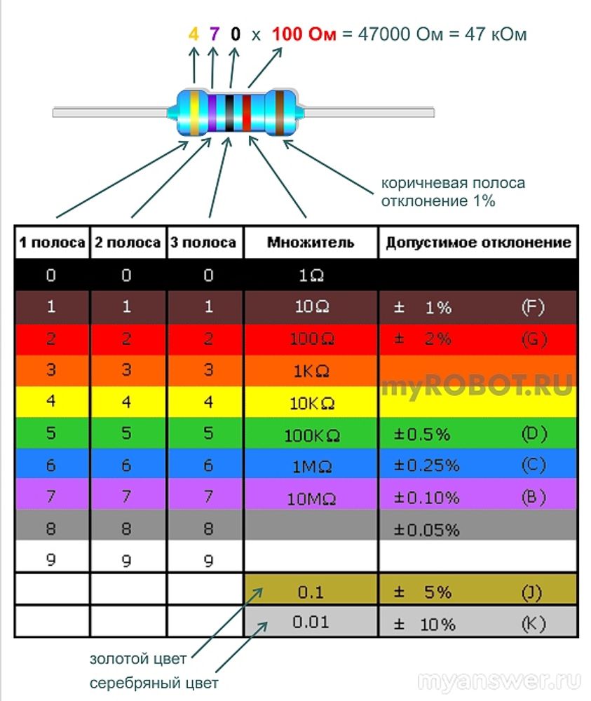 Но фотография может искажать цветопередачу, и всё может быть совсем не так, поскольку в маркировке резисторов встречаются оранжевый и коричневый цвета. И даже золотистый. Я вот не уверен, что жёлтые на фото одинаковые. Для надёжности пользуйтесь онлайн-калькулятором.