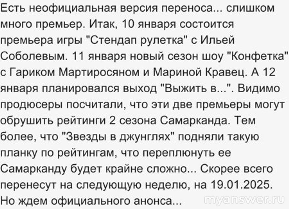 Хотя в сети и появилась информация, что шоу "Выжить в Самарканде. Игра сезонов" не выйдет в анонсированный день, у многих теплилась надежда, что 12 января шоу все же стартует. Так как в программе изменений не было.