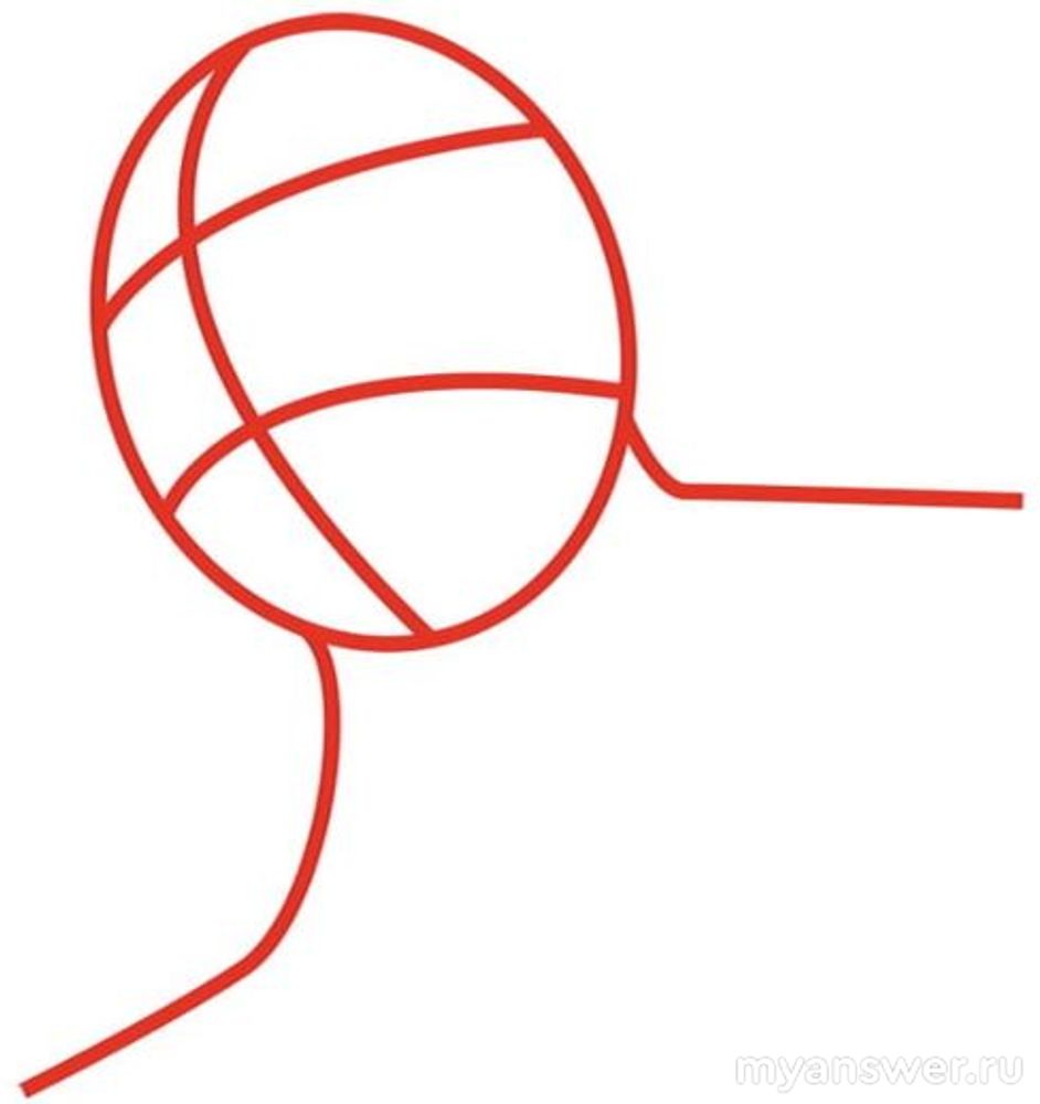 Первый шаг — сделать набросок. Для этого нужно нарисовать овальный шар, который разделите на две вертикальные части и три горизонтальные. Этими линиями мы определяем в какую сторону смотрит колоссальный титан. От условной головы титана продолжите линии вниз и в стороны, что будет будущими контурами плеч гиганта.