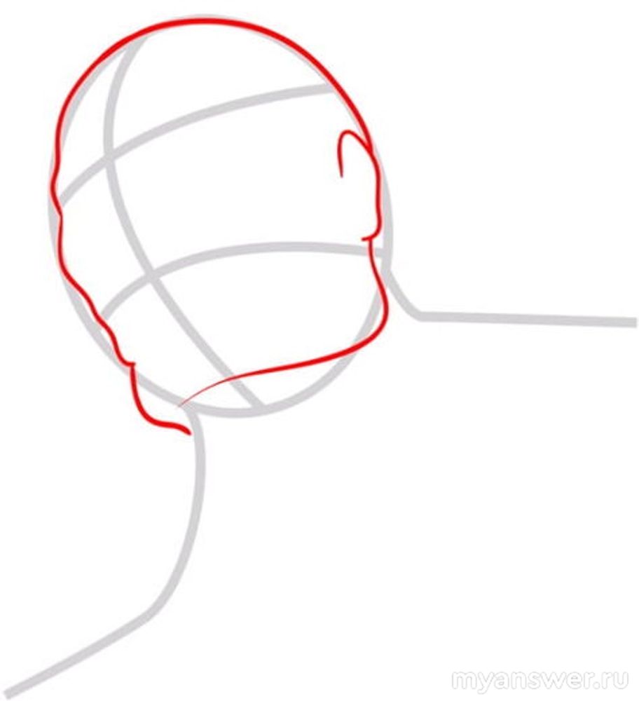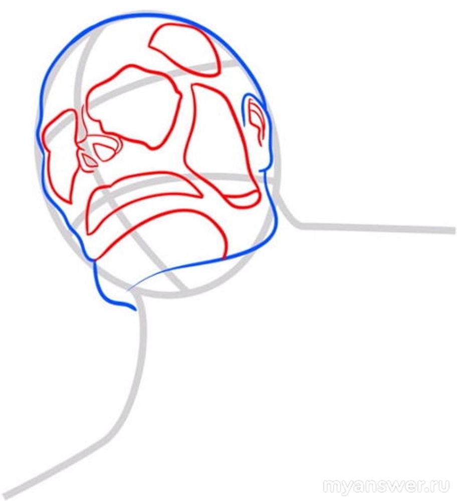 Второй шаг. На основе нашего наброска поэтапно дорисовывайте детали гиганта. Сначала это будут очертания лица с выделением подбородка и ушей: