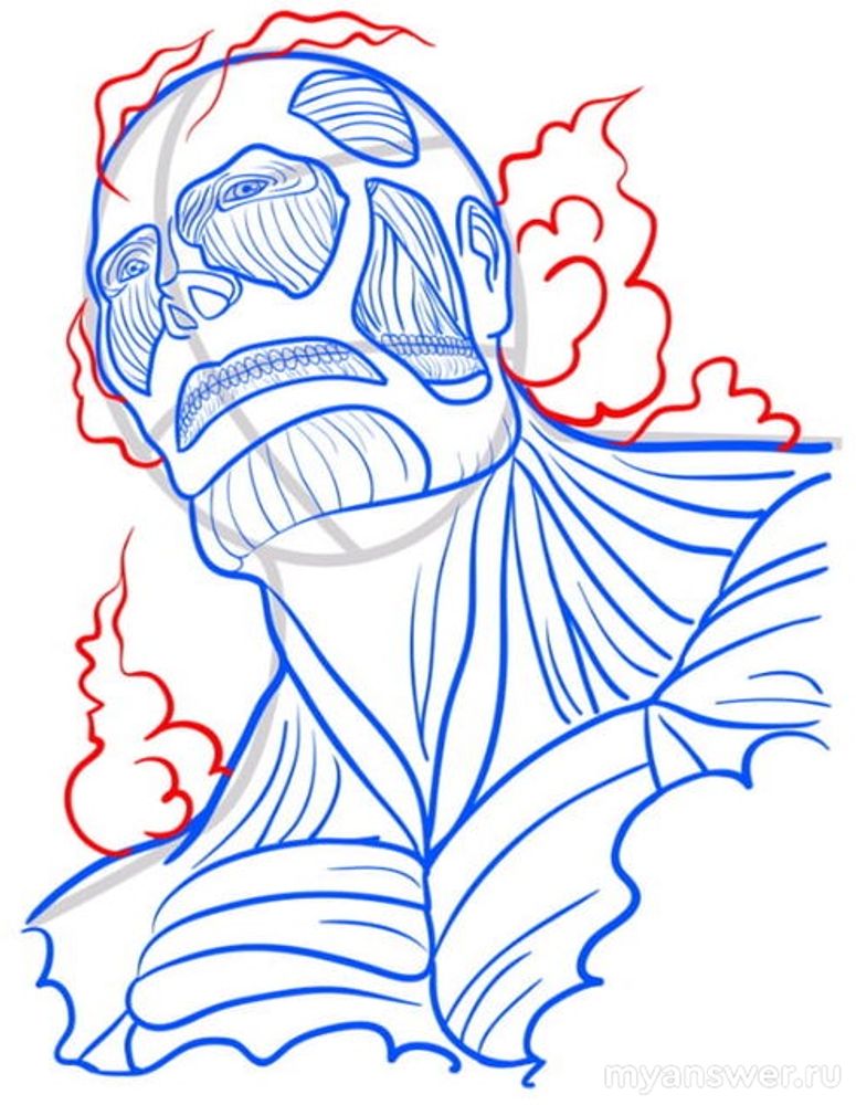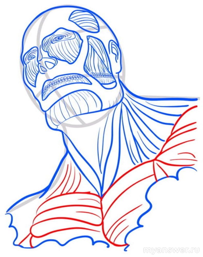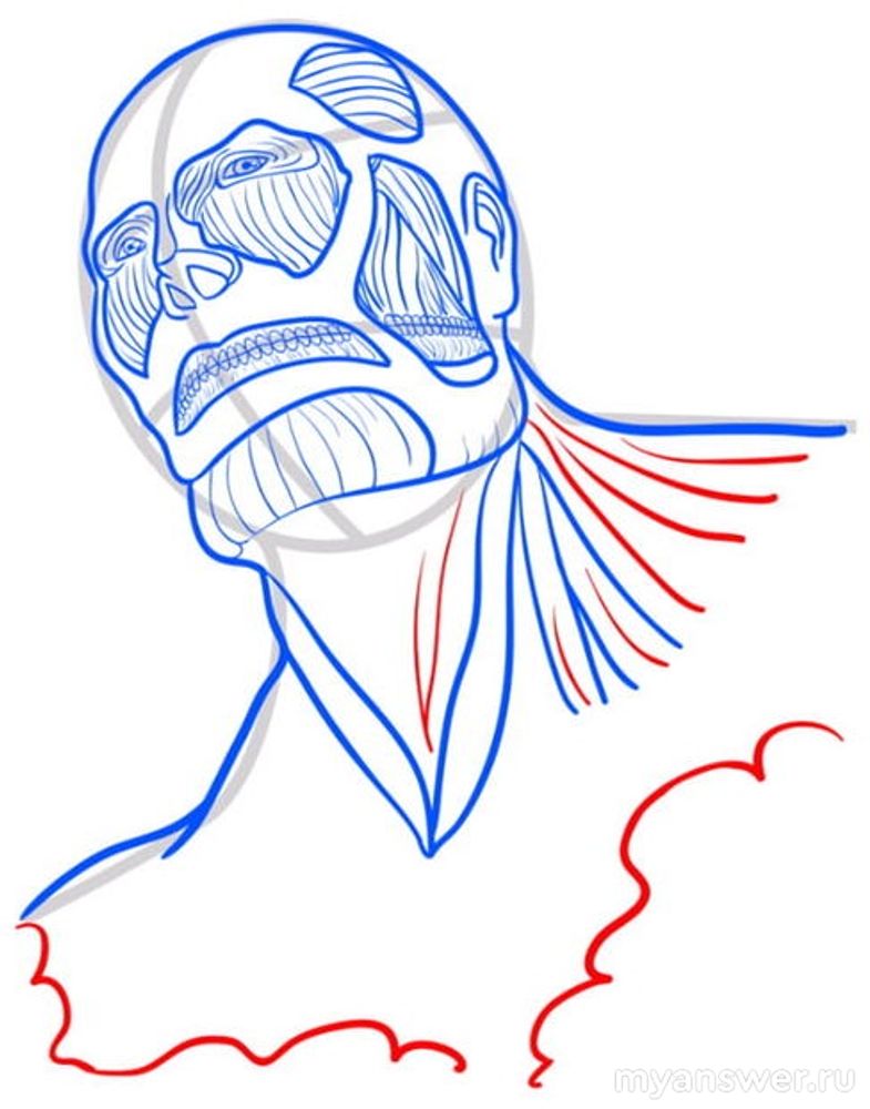 Нарисуем Колоссального Титана не в полный его рост, а изобразим его устрашающий бюст. Титан не покрыт кожей, видны его мышцы, через мышцы удаленные проглядывается его череп.