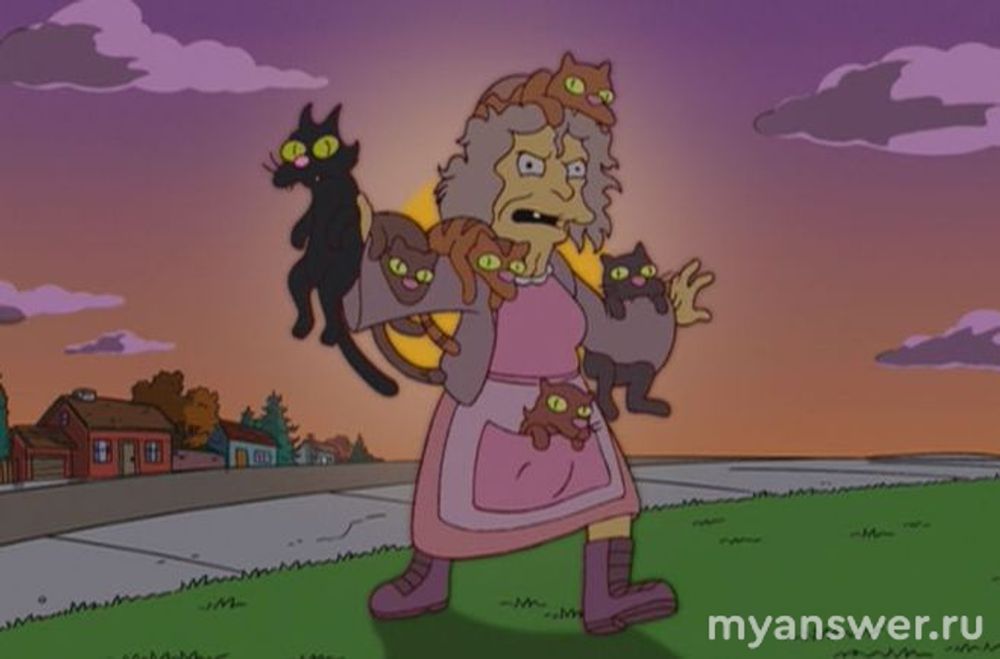 В поп-культуре же всё гипертрофировалось. Безумная кошатница из мультсериала "Симпсоны" пережила профессиональное выгорание, пристрастилась к алкоголю и окружила себя кошками.