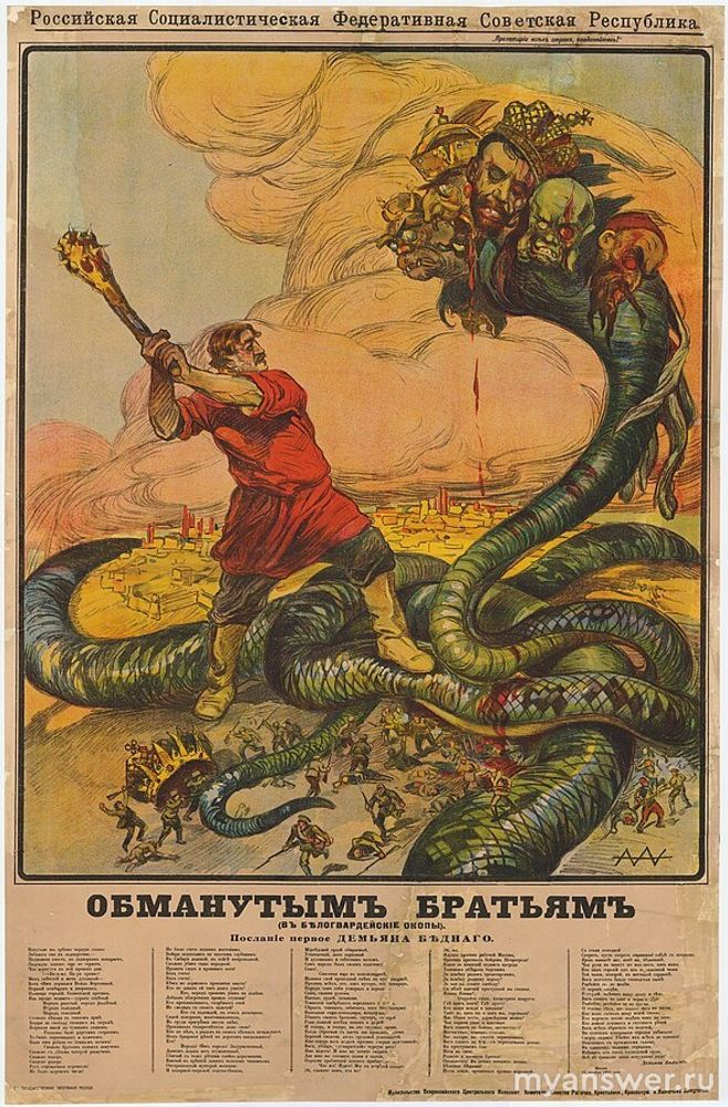 Сразу вспоминаются яркие агитационные революционные плакаты приведенные как иллюстрации в школьных учебниках истории трагического времени гражданской войны в России. Трагизм этой борьбы с возрастом понимаешь все острее и острее. Искомое слово пришло из мифов древней Греции. Слово обозначало чудовище. У чудовища было тело змеи и девять голов ( одна бессмертная). Головы были как у дракона. Срубишь одну- вырастает новая. Чудовище легко уничтожало все живое. Многие безуспешно пытались победить чудовище. Но и это чудовище было побеждено. Победил его герой- Геракл. Ответ на вопрос - гидра. Слово из 5 букв.