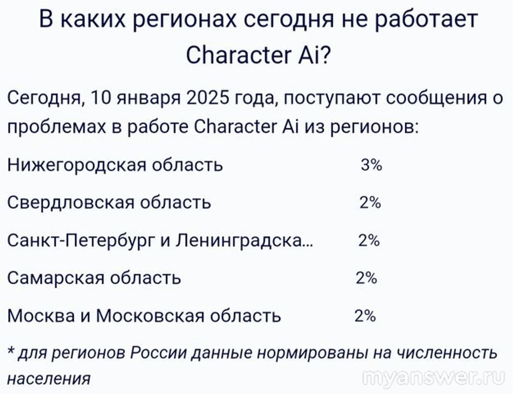 Зарегистрирована сегодня следующая статистика, касающаяся регионов, откуда поступали жалобы от пользователей, фиксирующих 10.01.2025 проблемы в работе Character Ai: