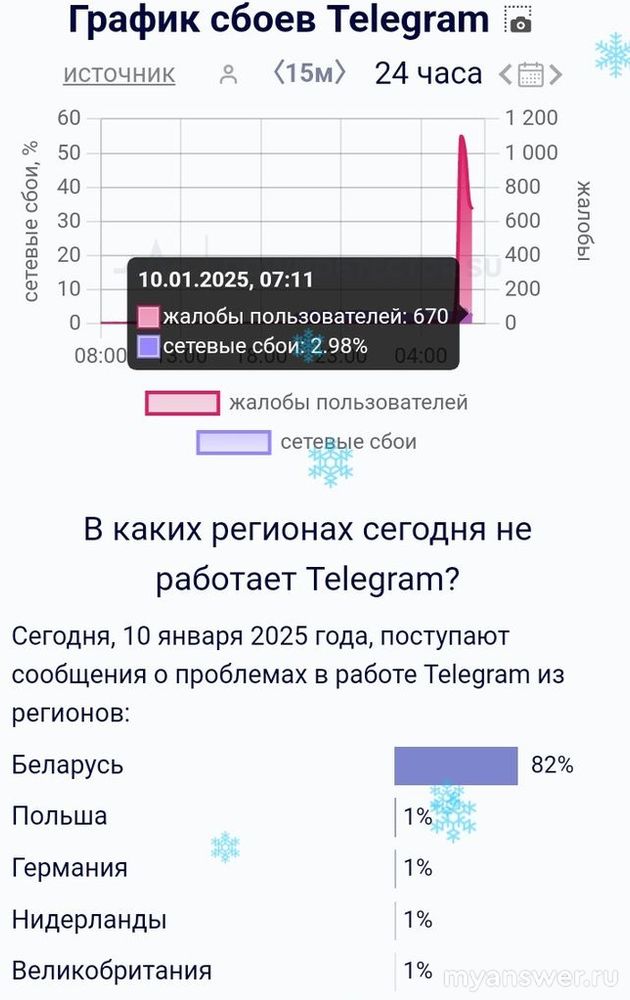 Сегодня 10 января 2025г, после полуночи, у многих пользователей в Беларуси, по отзывам , перестал работать мессенджер Телеграм.