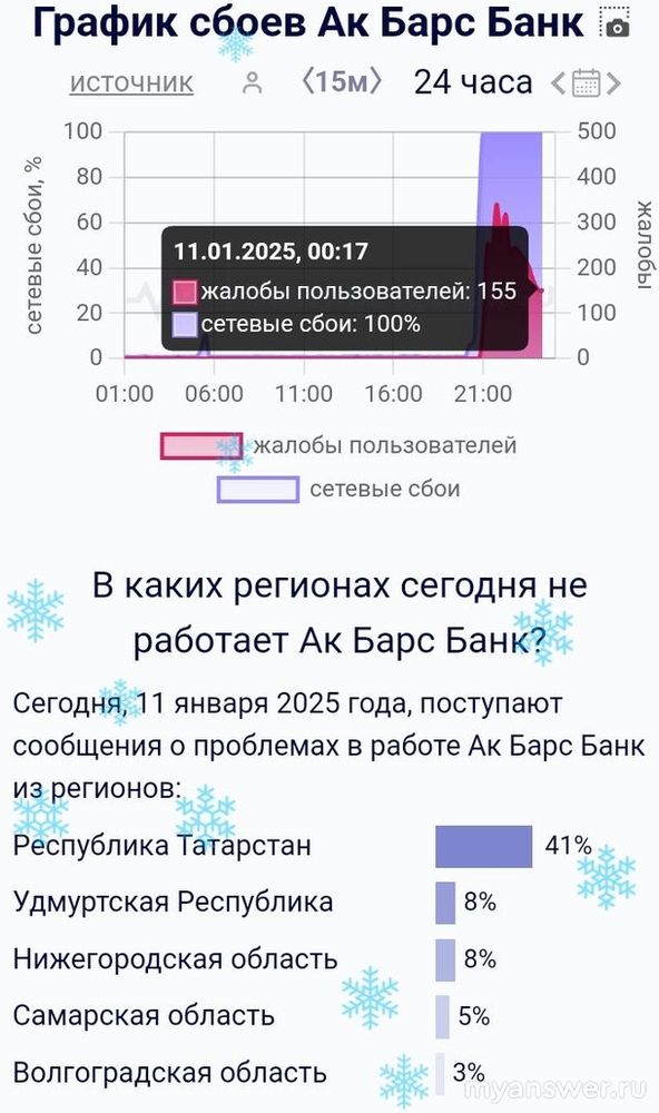 10 января 2025 года около 17 часов вечера по московскому времени у банка Ак Барс возник сильнейший сетевой сбой. Хотя первый звоночек был этим же днем с 1 до 2 часов ночи. Но ночной сбой был не сильным и кратковременным.