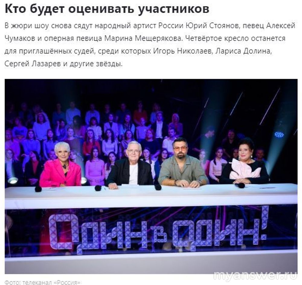 Я это шоу не стану смотреть из-за того, что одним из ведущих там будет Клава Кока. Николай Басков хоть и поднадоел, но не вызывает раздражения. А вот судьями на этом шоу в новом 6-м сезоне будут 3 постоянных судьи и один будет меняться каждую неделю. То есть три постоянных судьи и один приглашённый в каждом новом выпуске. 1-й судья- народный артист России, мастер перевоплощения Юрий Стоянов, 2-й- двукратный победитель шоу "Один в один" Алексей Чумаков и 3-я- оперная дива Мариша Мещерякова. Эти же персоны были судьями и в прошлых сезонах.