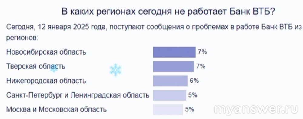 У ВТБ довольно-такт много клиентов, не зря же его так рекламируют тщательно. Сейчас практически все люди пользуются банковскими сервисами через интернет. Двенадцатого января люди отметили, что в работе данного банка имеются проблемы. Приложение для телефона на работает, оплата не проходит, не могу на сайт зайти, оплату провести не получается, личный кабинет не работает. Двенадцать человек пожаловались в тринадцать тридцать по московскому времени. Это стало пиком сегодняшних жалоб. География их от московской области и до Новосибирской области. Выглядит таким образом: