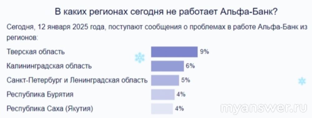 В различных регионах нашей страны есть клиенты Альфа-Банка. Двенадцатого января от них стали разного рода жалобы поступать, касающиеся некорректной работы его сервисов. Не могу в личный кабинет попасть, сбоит мобильное приложение, вылезает сообщение об ошибке при попытке входа на сайт, зависает, тормозит, не загружается. Пик жалоб отмечен в двенадцать тридцать по Москве, когда сразу восемь человек пожаловались. Еще и по три, четыре человека каждый час жалуются. География жалоб от Калининграда и до Якутии: