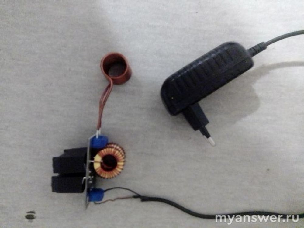 Данный нагреватель может нагреть воду в небольшой стальной колбе, вставленной в катушку.