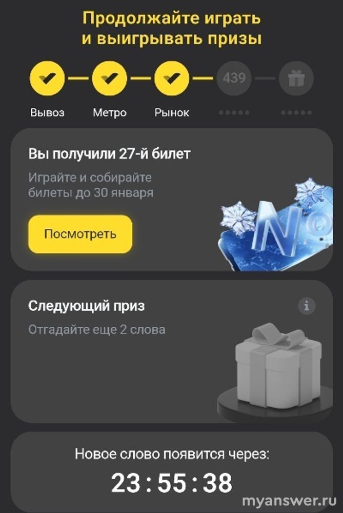 Вот так я разгадал третье слово из пяти, а значит до следующего приза мне осталось угадать ещё два слова, ну, а пока 27-ой билет будущего розыгрыша денежных призов пополнил мою коллекцию.
