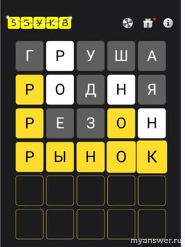 Поменял местами буквы Н и Р и моей четвёртой попыткой стало слово "рулон", в котором после проверки уже две буквы, Р и О горели жёлтым цветом, а буква Н всё ещё на белом фоне.