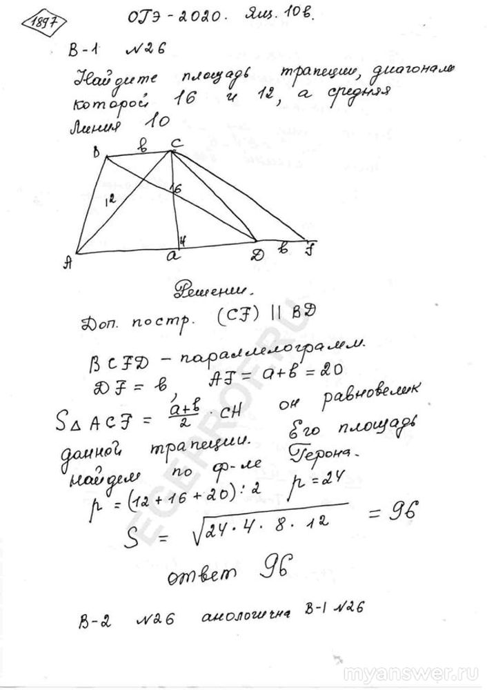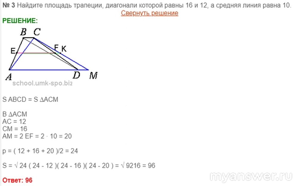 "Построим треугольник на одной из диагоналей трапеции так, что вторая его сторона параллельна другой диагонали трапеции, а третья сторона треугольника проходит вдоль основания трапеции. Длины двух сторон этого треугольника равны длинам диагоналей трапеции, а длина третьей стороны равна сумме длин оснований трапеции. Высота треугольника опущенная на эту третью сторону равна высоте трапеции. Следовательно, площадь этого треугольника равна искомой площади трапеции.