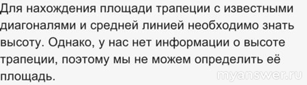 Ответы людей.Школьные задачи по геометрии с их решениями о нахождении площади трапеции с известными диагоналями и средней линией в интернете предостаточно, в них меняются только численные значения. Одну из них можно найти даже здесь на БВ.