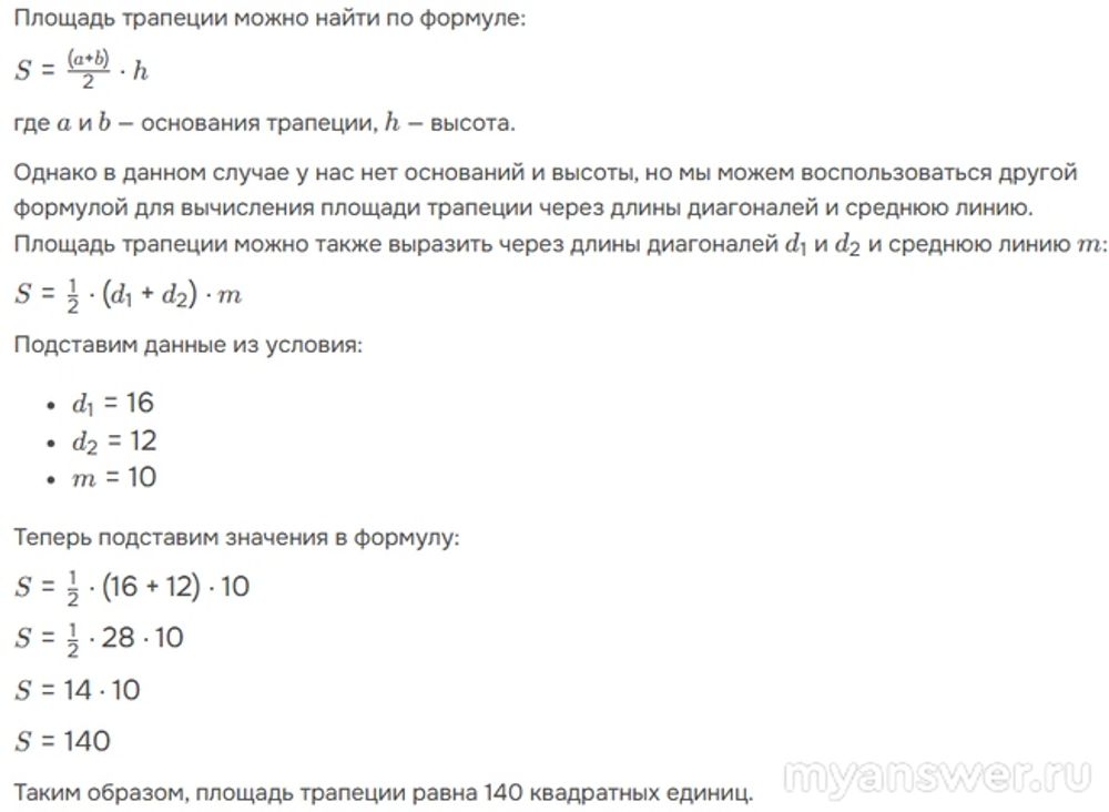При решении задачи о нахождении площади трапеции с диагоналями 16 и 12, и средней линией, равной 10, получено следующее решение.