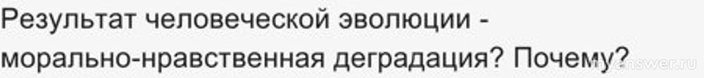Результат человеческой эволюции - морально-нравственная деградация?.. В мире(человеческом) дела делаются не по воле всевышнего, а по плану тех кто в состоянии править этим миром. Рычаги влияния на эволюцию человечества подвержены товарно-денежным отношениям! Кто платит за стол, тот танцует с девушкой! И вот этим плательщикам выгодно чтобы человечество катилось как по накатанной горке в пучину дебильности и примитивизации! У них в идее "золотой миллиард" и на реализацию этой идеи поставлена вся политика, экономика, философия, разработка моральных устоев, санитария и медицина! Человечество не просто гнобится, а ради великой цели - самодостаточного, идеального мира!