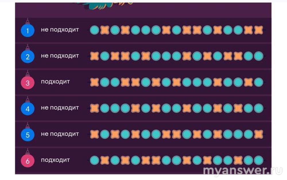 Ещё одно задание из олимпиады по математике на Учи.ру, оно называется "Гирлянда". Даны шесть гирлянд с "крестиками" и "ноликами", нужно определиться подходят они к венку или нет. При решении этой задачи нужно обратить внимание, что в каждой гирлянде есть три подряд идущих элемента "нолика", от них надо и начинать укладывать гирлянду на венок. В результате подходят к венку гирлянды с номерами 3 и 6.