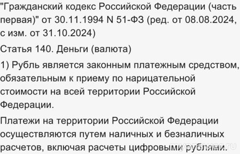То есть прекрасно видно, что законодательство на сегодняшний день обязывает принимать на территории Российской Федерации как наличные, так и безналичные формы оплаты, включая и цифровые. Разумеется, исключая те случаи, когда для этого нет технической возможности, например из-за поломки.