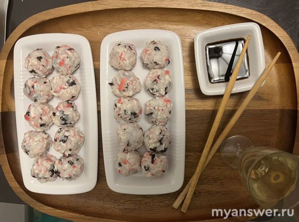 Рис отварить (не солить), затем влить влить в него 2 ст. ложки рисового уксуса с растворенным в нем сахаром, крабовые палочки натереть на крупной терке, измельчить водоросли нори (руками или ножницами). Смешать хорошенько рис, крабовые палочки и водоросли нори. Смочить руки водой и наделать небольшие шарики из полученной массы, подать к столу с соевым соусом. Из указанного количества продуктов получается 36-40 быстрых роллов.