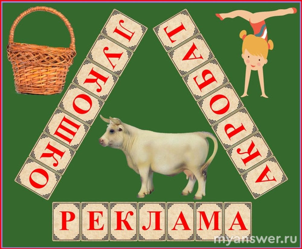Для начала рассмотрела карты двух игроков, у которых после замены букв получились слова "реклама" и "лукошко". Обмен картами происходил по часовой стрелке. Это значит, что изначально у игрока со словом "реклама" не было каких-то двух букв из этого слова, но зато были буквы из слова "лукошко", которые он передал по часовой стрелке. Таким образом, у нас есть все буквы и даже 7 лишних, чтобы образовать одно подходящее слово, которое было вместо "рекламы". Подходящее - это слово, которое как-то связано с травой, растениями. У меня получилось слово "ромашка".