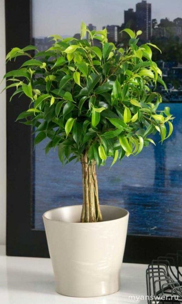 Фикусы также обладают яркими глянцеаыми листьями и хорошо очищают воздух. Популярны каучоконосный фикус и фикус Бенджамина.