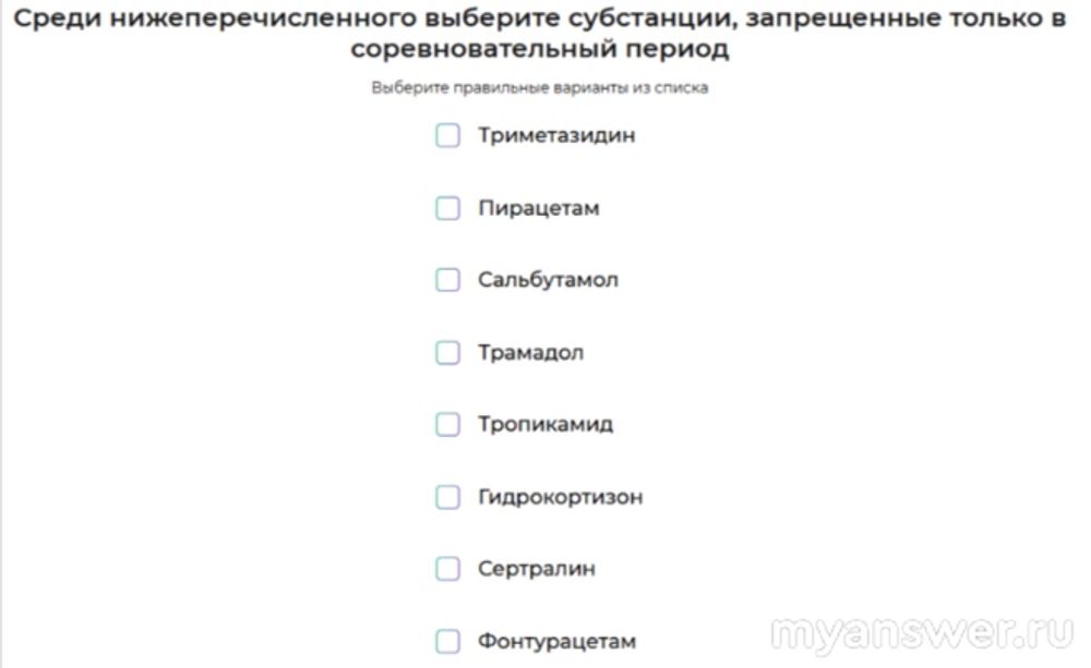 Упражнения для медперсонала на обучении по курсу антидопинг намного сложнее чем для спортсменов, вопросы более специфические. Например, если спортсмену нужно проверить только один препарат, то медикам нужно в вопросе с многими верными ответами проверять каждую отдельно взятую субстанцию. Берём сервис проверки препаратов от РУСАДА по ссылке и вбиваем каждое название. Если хоть один ответ неправильный - высветится "Пока неправильно, попробуйте ещё раз"
