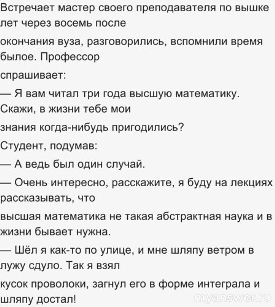 Одно дело теория и совсем другое — практика. Но, с другой стороны, одно другому не мешает, а, наоборот, поддерживает и помогает. Не так много людей понимает высшую математику, но лично я рад, что смог научиться вычислять хотя бы некоторые базовые интегралы. Это полезные знания, они не помешают человеку, несмотря на то что существует саркастический анекдот.