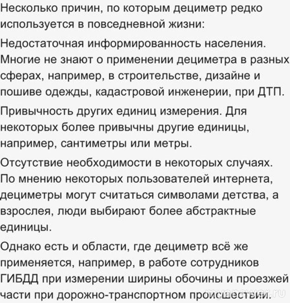 Как копейка было воспрянув после деноминации быстро канула в Лету, так и ваш дециметр практически исчез (разве что в гробовом ремесле остался еще, да и то у ручных дел мастеров).