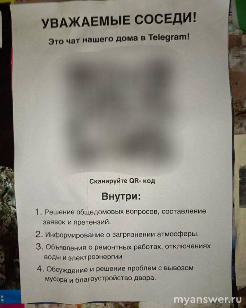 На двери подъезда повесили листок с объявлением: это чат нашего двора в Телеграм, сканируйте куар - код.