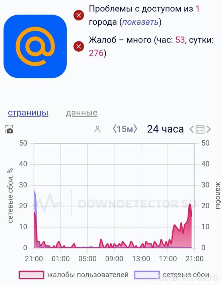 Ошибки 500 и 505 свидетельствуют о невозможности выполнить запрос к почтовому серверу. Причины появления этих ошибок могут быть различные. Ими могут быть неправильно введённые логин или пароль, а также большая нагрузка на почтовый сайт, когда одновременно у серверу обращается большое количество пользователей. Если самостоятельно не получается устранить ошибку, рекомендуется обратиться к вашему провайдеру интернета, скорее всего он проводит технические работы. Как раз сетевые проблемы стали причиной жалоб в работе Mail.ru и Мой Мир с 19 по 20 января 2025 года. Это видно на графике сбоев (пики в районе 21.00)