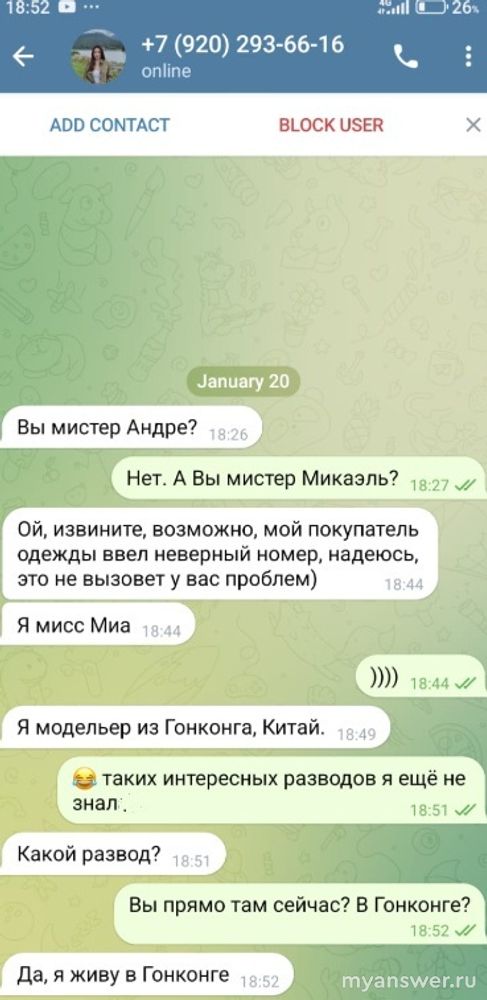 Как интересно узнать, что я не один такой. Второй раз мне пишут "из Гонконга")) Первый раз - несколько месяцев назад - написала якобы финансистка (конечно же, еще и красавица - а у меня фетиш на азиатских девушек). Когда стала навязчиво мне предлагать научиться играть на бирже, торговать криптой и т.п. - я свалил, потому что не люблю вот это все финансовое. И что Вы думаете?.. Вчера мне пишет уже "модельер" - еще более красивая девушка из Гонконга)) В оба раза одна и та же схема: мол, случайно написала...
