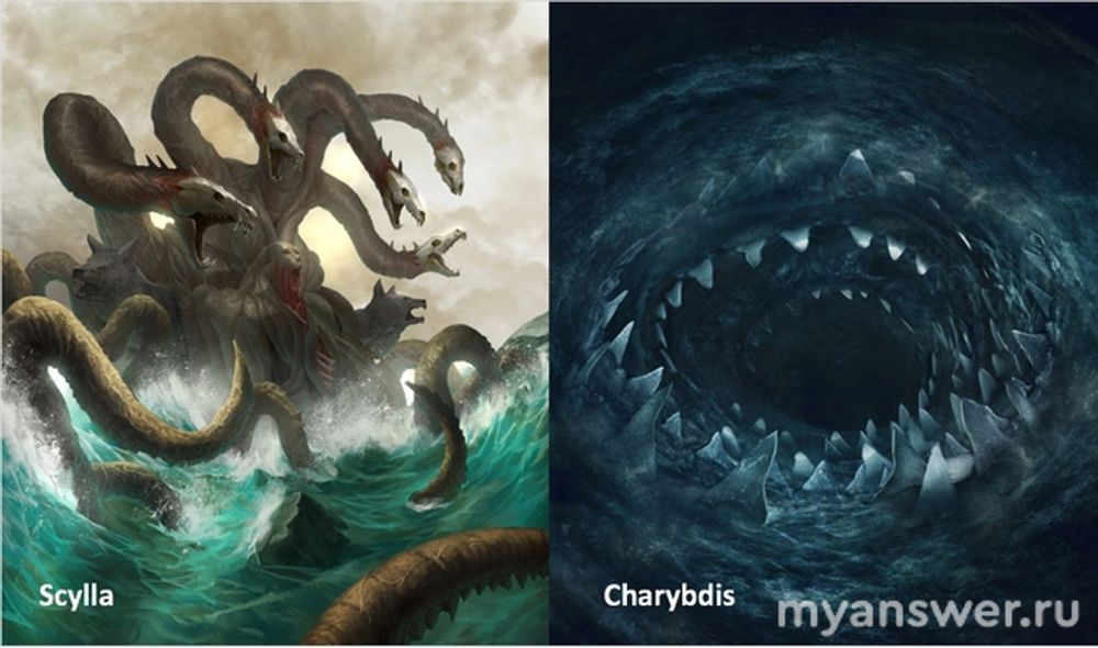 Чудовище Харибда из греческой мифологии.Оно, чудовище живет у скалы в узком проливе. И засасывает морскую воду в свою пасть, а потом выпускает. Через этот пролив должен был пройти корабль Одиссея. Опасное приключение. Многие корабли нашли свою гибель от чудовища. Осталось выражение