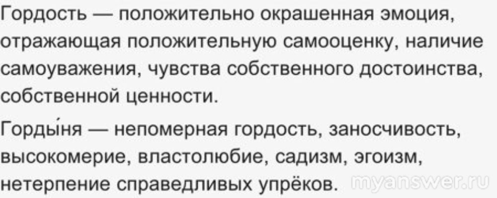 Не всё мне тут нравится в этих определениях, но суть примерно понятна. Особенно важна фраза: Горды́ня — непомерная гордость. Вот кто может определить, когда гордость начинает "зашкаливать" и превращается в непомерную? Ведь чтобы она стала непомерной, ей нужно подняться, развиться, поставить себя выше других. В некоторых случаях это может произойти очень незаметно.