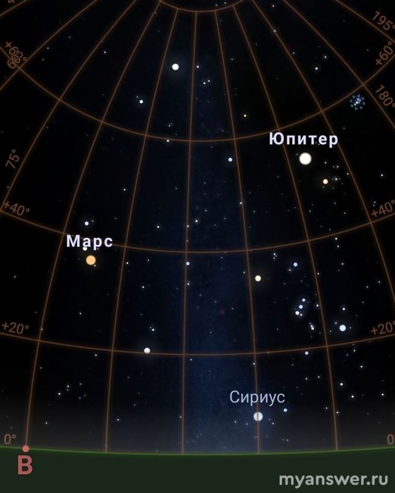На 20.00 по московскому времени Марс на востоке, Юпитер, примерно, на юге. Низко можно увидеть переливающийся бело-сине-красный Сириус - самую яркую звезду северного полушария. Между Юпитером и Сириусом - красивое созвездие Ориона.