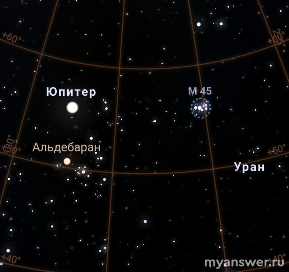 Вот участок неба, рядом с Юпитером. М45 - это звёздное скопление Плеяды.