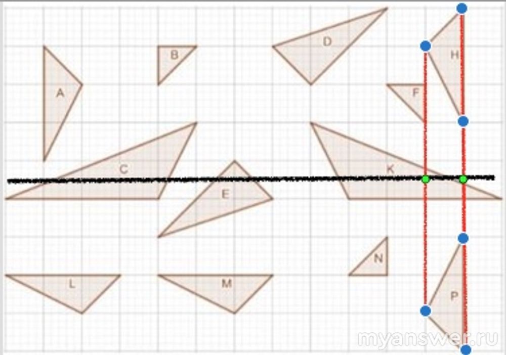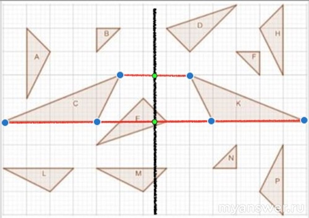 Аналогично, с вертикальной осью, относительно неё симметричными будут треугольники C и K: