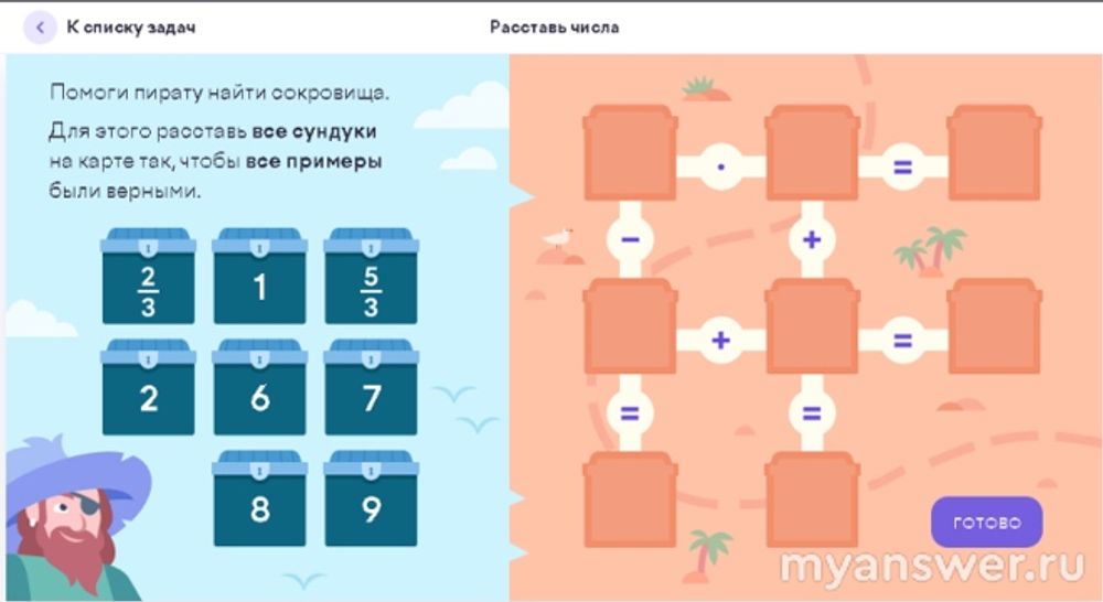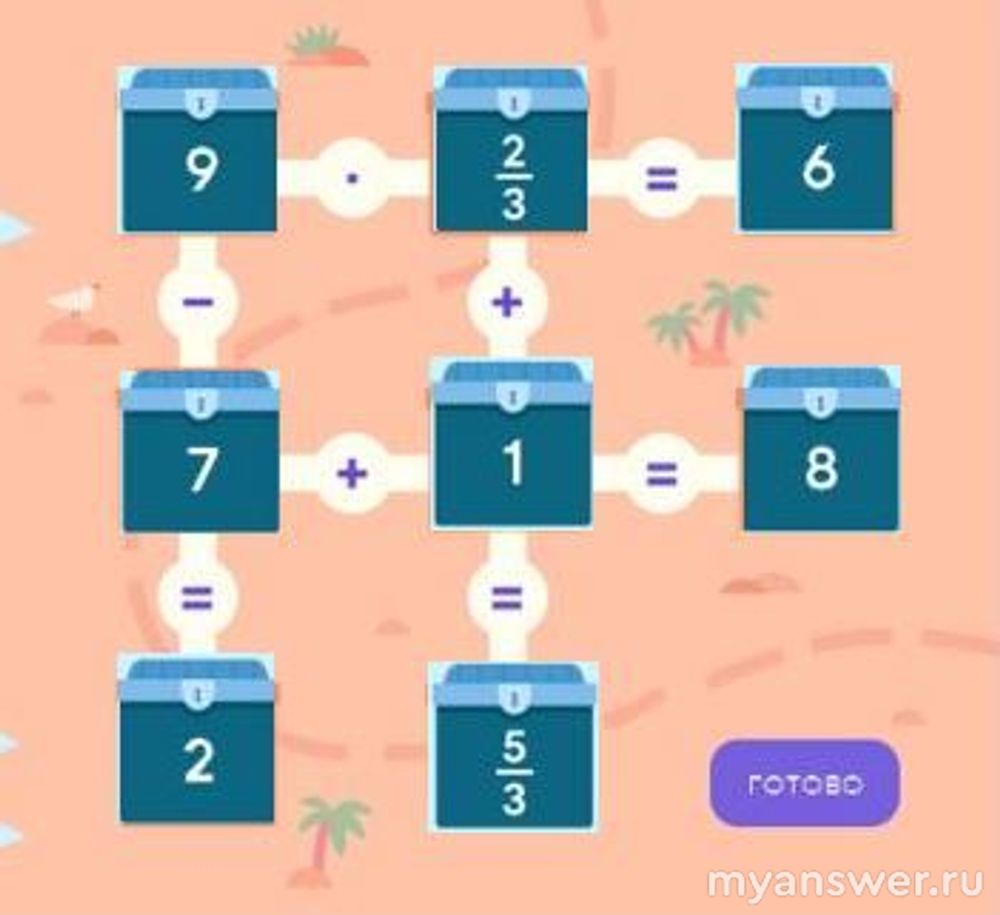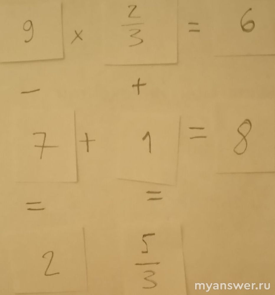 Задачка оказалась совсем не простая, поскольку присутствуют дроби, было сложно их поставить так, чтобы получалось верно. Отгадка таится в том, что одна из дробей неправильная, то есть 5/3 можно представить как 1*2/3. Получается, что к одной нашей дроби, а именно 2/3 нужно прибавить 1, чтобы получить другую нашу дробь, а именно 5/3.
