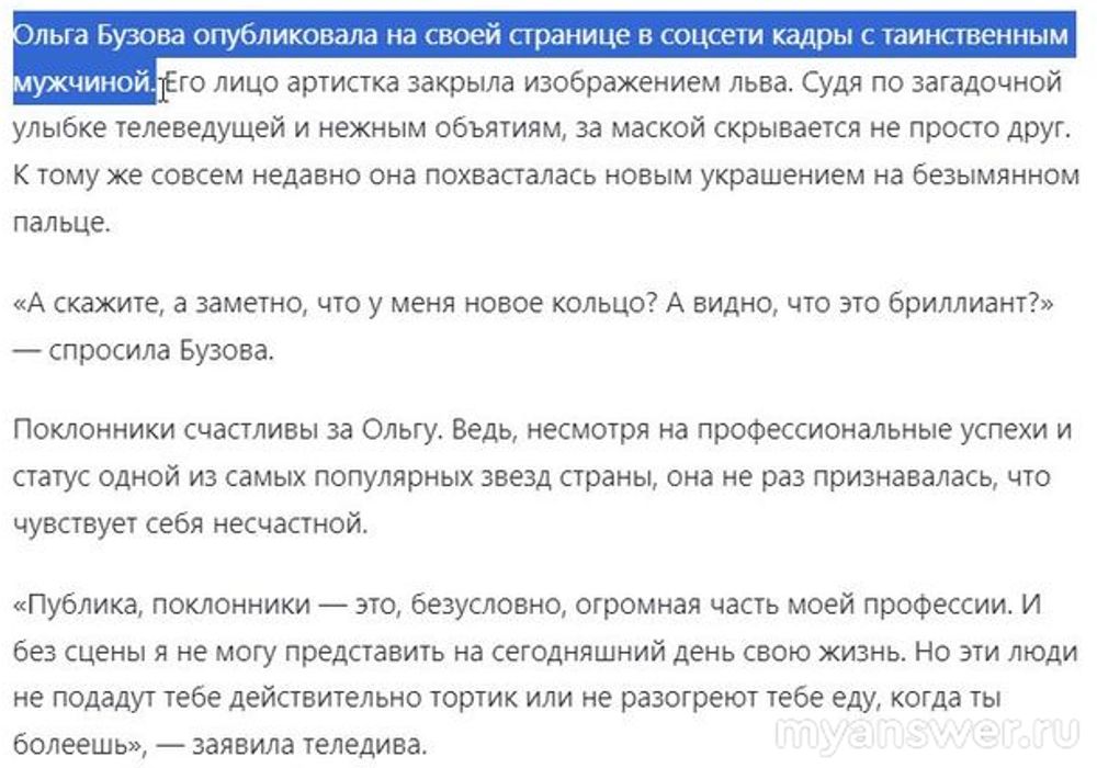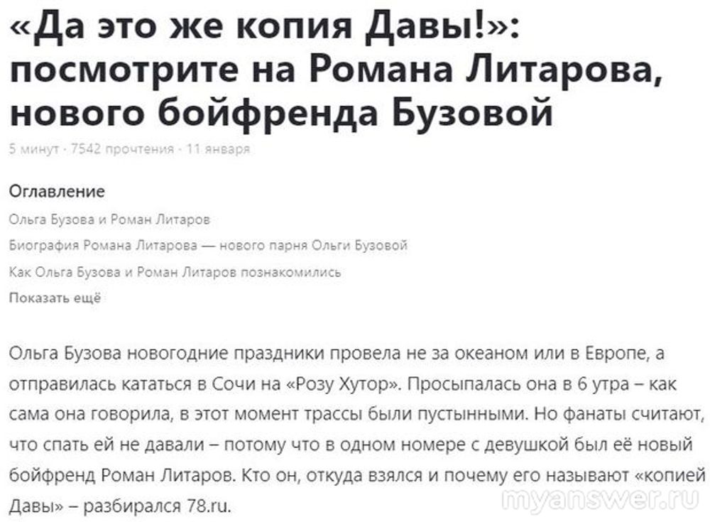 Ольга Бузова меньше чем через год разменяет свой пятый десяток лет, а всё ищет себе новых парней, беременеет от них, а потом всё это оказывается неправдой. Зато хорошо подогревается интерес к диве со стороны интернет аудитории. У ровесниц Оли дети уже учатся в школах, институтах, а она всё в поиске новых отношений. Бузова пытается скрыть имя своего нового возлюбленного, по той же причине, что указана выше. Но интернет всё уже знает и указывает на некоего Романа Литарова, юриста из Сочи. Посмотрим, чем закончится этот союз, для разогрева интернет аудитории осталось дождаться очередной новости от Бузовой, что она наконец-то ждёт ребёнка...