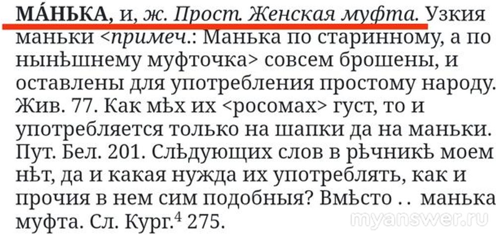 Эта привлекательная, милая штучка в женском костюме практически всегда составляла ансамбль с меховой шапкой и воротником. В России она получила свое распространение в XVIII веке (привез Петр I как веяние из Голландии, что интересно как деталь и мужского, и женского туалета). А уже во второй половине XVIII века редкий модник обходился без этого, её носили на шнурах и цепочках, она могла быть были узкой или широкой, из меха или с мехом, по последнему веянию моды и классической. Манькой называли муфту из соболя или из меха длинношерстных овец.