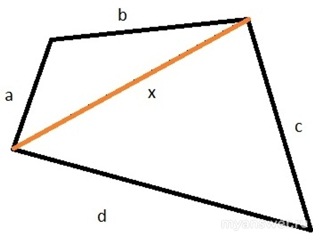 Обозначим стороны четырёхугольника a, b, c, d. А диагональ обозначим х.