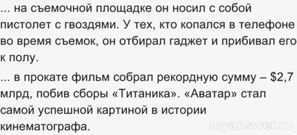 На съемочной площадке Кэмерон носил с собой гвоздемет. Если у кого-то из артистов звонил телефон, он прибивал этот телефон гвоздями к стенке. Название фильма «Аватар».