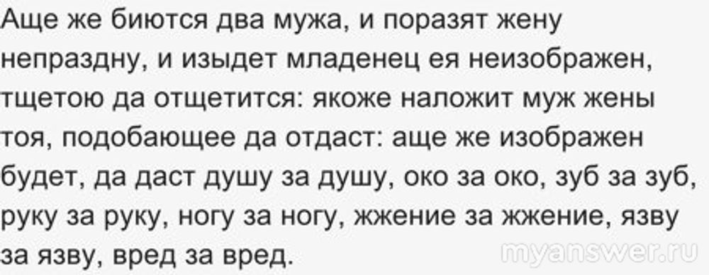 Если выкинутый "младенец неизображен" - не имеет человеческого облика, то виновный должен заплатить штраф. Если имеет человеческий облик - виновника должны убить: "душу за душу".